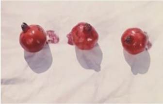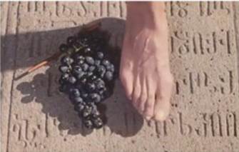 Diversos motivos definen el léxico del cineasta, elementos destinados a jugar un papel concreto dentro del ámbito alegórico. Granadas sangrantes, una concha, un aguamanil, uvas prensadas y otros tantos objetos y elementos que no cesan de aparecer durante toda la película. De hecho, tres planos sirven de apertura (tres granadas, en Figura 2), uvas prensadas bajo los pies (Figura 3) y un cuchillo dando paso a un círculo cerrado de apariciones alegóricas. Cada figura va siendo transformada, desplazada, anulada y después recuperada. Observemos el elemento líquido. Su valor simbólico exigiría todo un estudio concreto, pero es obvio que conecta toda la película: del agua al tinte, del tinte a la leche, de la leche a la sangre, etcétera. Paradjanov opera con signos, mensajes codificados que conforman un verdadero collage escénico.