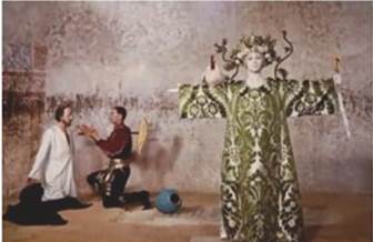 Observemos la cruz que se establece entre la mirada actor-espectador y el plano frontal de la escena. Los movimientos se limitan a esta cruz que se forma entre los dos ejes y que se refuerza a veces de forma exagerada, con un desplazamiento lateral de los actores moviéndose horizontalmente de una punta del plano a otro sin girar el cuerpo. El paso de perfil a frontal que se efectúa girando la cabeza es uno de los más elocuentes. Abrir los brazos en cruz, poner la mano frente al cuerpo o sujetar un objeto con el brazo tendido en horizontal son algunas de las variaciones de esta línea de movilidad artificiosa. La estaticidad del tableau vivant se altera (¿o se refuerza?) en ocasiones de forma mínima, con el personaje rotando sobre sí mismo o, por ejemplo, envolviéndose en un tapiz, creando una nueva variante que continúa respetando esa “T”.