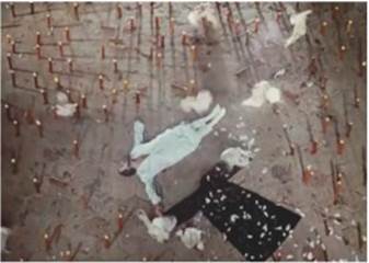 La escena de la muerte del poeta cierra la obra en un circuito cerrado y cíclico. El poeta yace en el suelo rodeado de velas (Figura 22). Su muerte se simboliza con una lluvia extravagante de gallinas ensangrentadas. En el contraplano, vemos al niño colgando de una cuerda del techo, adoptando la postura de los brazos en cruz y sosteniendo alas doradas en sus manos (Figura 23). Mira fijamente hacia abajo, hacia el poeta.