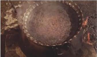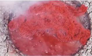 Una estructura similar a esta economía del don rige todo el largometraje. Cada secuencia desencadena otra similar, una devolución. La secuencia se recupera y se transforma del mismo modo que la ofrenda recibida por el donatario se transforma en ofrenda entregada. Se forma así una simetría, un juego anafórico de dobles escenas, de dobles versos. La película es un poema que juega constantemente con un esquema de estrofas que riman siguiendo la estructura A-B. Veamos algunos ejemplos de este eco visual: la escena en que varios hombres lavan pisando con sus pies las alfombras empapadas tendrá su reflejo en aquélla del prensado de uvas, o los platos circulares recibiendo primero el tinte para, escenas más tarde, acoger la sangre de un sacrificio (Figuras 4 y 5).