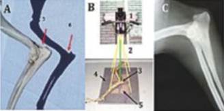 Dependiendo de las características físicas del objeto (la misma articulación ósea del codo de un perro) dará tonalidades que van del negro (radiolúcido) al blanco (radiopaco), pasando por un sinfín de tonos grises intermedios. Esto permite el contraste entre las diferentes estructuras anatómicas (Fig. 1C). No obstante, en la radiografía que es también una figura de dos dimensiones (2D), por el efecto del juego de sombras y la formación mental de la imagen con base al conocimiento anatómico, se logra la apariencia de tridimensionalidad (3D), que es lo que se busca evidenciar de acuerdo con nuestro argumento.