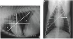 Una configuración mental tridimensional basada en un sistema de ejes requiere de las coordenadas X, Y y Z representadas en la Figura 2., por lo que se hace necesario obtener al menos dos radiografías ortogonales para obtener esta configuración tridimensional. De esta manera, el eje X va de izquierda a derecha, el eje Y de abajo hacia arriba y el eje Z de atrás hacia delante (Garrosa-Sastre, 1998). Considerando la nomenclatura utilizada para designar las imágenes radiográficas, así como los nombres anatómicos basados en la Nómina Anatómica Veterinaria (Gasse H., 2012) y aplicando el sistema de ejes en la cavidad torácica de perro, en una radiografía lateral derecha (LD), Figura 3A, el eje X sería desde lo craneal hasta lo caudal (“ancho”); el eje Y sería desde lo ventral a lo dorsal (“alto”), y el eje Z sería del lado derecho al lado izquierdo de la cavidad (“espesor”).