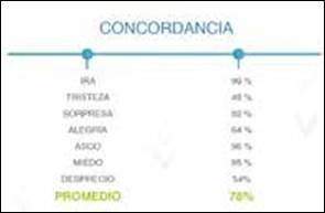 Hallazgo precisión de concordancia. El nivel de concordancia entre el estímulo auditivo presentado versus la percepción positiva/negativa que esta pueda expresar tuvo una precisión promedio del 78%, es decir, en 8 de cada 10 casos la transmisión de la percepción emocional fue decodificada de manera correcta por el investigado, dejando claro que los tonos son capaces de transmitir y aportar sensorialmente dentro de la comunicación. (Tabla 2).