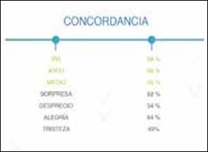 Hallazgo concordancia negativa. Las personas investigadas se les hizo más fácil identificar sensaciones negativas que positivas. Esto ocurre porque el cerebro está diseñado para identificar las ¨diferencias¨ y con ello las emociones negativas. (Tabla 3).