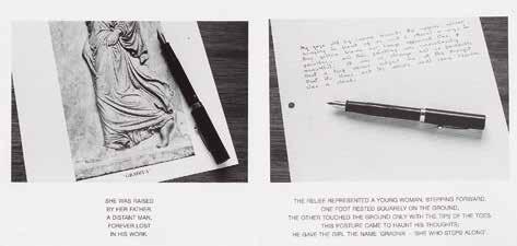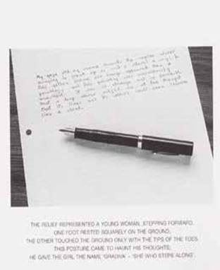 Una muy interesante lectura final surge precisamente de la conjunción de paralelismos visuales, transversalidad de medios y una perspectiva y reflexión psicoanalíticas. En la última fotografía de la serie Gradiva, aparece la imagen de una pluma estilográfica que no está cerrada por su capuchón; se sitúa sobre un papel, al pie de un texto que ha sido copiado a mano y después fotografiado. Es la única imagen de la obra en la que no aparece una representación visual de la figura humana. Sigue compartiendo, no obstante, otra similitud esencial con la imagen de la primera composición, una similitud que puede añadirse a los diversos paralelismos que se habían apuntado en páginas anteriores. En ambas fotografías hay una conjunción primordial entre imagen y texto, lo plástico y lo literario. En las dos escenas, una pluma aparece reposando sobre algo: en la última composición, la pluma está apoyada sobre un papel escrito, unas líneas que a su vez describen una imagen que aparece en un espejo, un reflejo que además parece una pintura.
