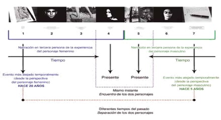 Aunque las dos narraciones (desde la perspectiva femenina y desde la masculina) están integradas y son explicadas desde el relato de Jensen, no cuentan los mismos momentos de la historia; no hay una correspondencia cronológica exacta entre ellos, excepto en el caso de las composiciones cuatro y cinco, que se refieren a un mismo instante desde dos puntos de vista diferentes: sujeto observado (mujer) y sujeto observante (hombre).