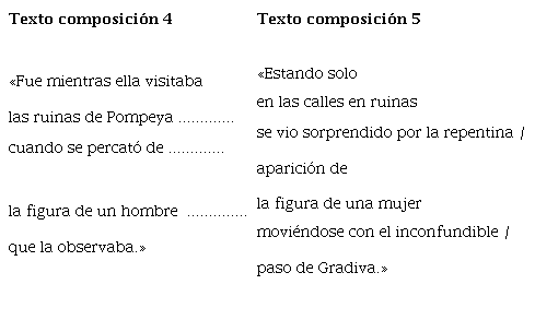 Si los tres primeros planos de los rostros (imágenes de las composiciones dos, cuatro y seis) comparten obvias similitudes formales que los diferencian del resto de las fotografías (el contraste del fondo negro y profundo con el único elemento retratado, las blancas caras humanas), las imágenes restantes (de las composiciones uno, tres, cinco y siete) participan de un mismo argumento textual, pues narran cronológicamente los contactos y la relación que mantiene Norbert Hanold con ZoëGradiva. Es decir: conocimiento del relieve a través de sus estudios (imagen uno), descubrimiento de la mujer real en las ruinas de Pompeya (imagen tres), y encuentro amoroso (imagen cinco). En esta fotografía, Gradiva, la mujer pasante, queda en un segundo plano, se aleja, mientras que la pareja (Norbert y Zoë) permanecen ya unidos.