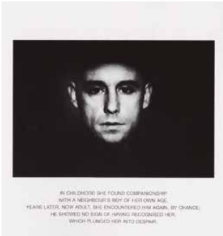 A través de esta nueva asociación de imagen y texto, se produce una alteración en el papel del espectador: en la composición original, había una identificación entre el público y el personaje masculino observante que describe el texto; ahora el espectador se convierte en el personaje femenino observado por el rostro de la fotografía.