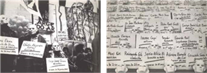 Seguramente ese elemento se haya usado en otra oportunidad en París, como prueba una fotografía de Henri Cartier-Bresson que la agencia Magnum atribuye a la acción de AIDA en esa ciudad por los cien argentinos desaparecidos9. En la imagen se observa una manifestación donde resaltan algunas máscaras blancas y músicos tocando bajo la bandera Où sont-ils? (¿Dónde están?), mientras que en el primer plano una mujer de rostro serio y pañuelo blanco sobre la cabeza lleva el letrero nombrando al profesor de filosofía marroquí Abdellatif Zeroual, desaparecido en 1974, por detrás se identifica un manifestante enmascarado reclamando por el profesor chileno y ministro de Educación durante la Unidad Popular, desaparecido en 1976, Juan Antonio Gianelli Company. Por lo tanto, aunque las características no coinciden con las de la marcha de noviembre de 1981 a la que es atribuida, es evidente que se trató de otra actividad en reclamo por desaparecidos de distintos países del mundo, probablemente posterior10.