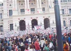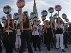 Las pancartas se convirtieron en un recurso sobresaliente del repertorio de esta protesta social. Por ejemplo, el 18 de septiembre de 2007, a un año de la desaparición de López, en una acción convocada directamente por la Multisectorial antes mencionada, se confeccionaron cuatrocientas pancartas-máscaras y se realizó una acción similar a la primera, pero aún más masiva. Asimismo, fueron un dispositivo visual de otras intervenciones del Colectivo Siempre como la performance “Contrasilencio” convocada al cumplirse dos años de la desaparición, el 18 de septiembre de 2008, en la que además de la utilización de las pancartas invitaron a los manifestantes a taparse la boca con una cinta adhesiva y cubrieron del mismo modo las de las estatuas de la ciudad (Figura 4).