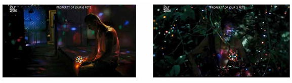 Dado que no existen planos que reúnan a los cuatro personajes, su conexión se remite al espacio y a los objetos: una serie de luces de discoteca que incluye un reflector en forma de esfera y las piedras brillantes que hay bajo la superficie. Sabemos que el juego de luces es similar porque emite un sonido parecido al de las luminarias que porta el soldado (Figura 1). Las rocas son reconocibles porque reflejan la misma gama de colores cuando brotan de la tierra y cada vez que el pescador las desentierra y las arroja al río para atraer a las mantarrayas.