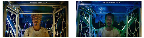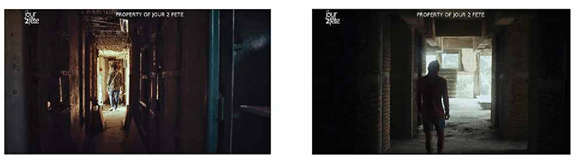 Como instancia formal, el retorno de Sanjai introduce paralelismos. Al igual que el pescador antes de su desaparición, Thongchai y la mujer padecen un malestar físico que les provoca vómito. En las secuencias finales, un plano muestra a Sanjai caminando hacia el fondo del pasillo de un navío militar. El plano muestra a la mujer de espaldas a la cámara. Un encuadre parecido visibiliza el recorrido del pescador por un pasillo en una construcción. Estos paralelismos acentúan la incertidumbre sobre la temporalidad del filme y sobre la identidad de los personajes (Figura 2). Son significativos porque develan que la analogía funciona como un principio de la forma minimalista del filme.