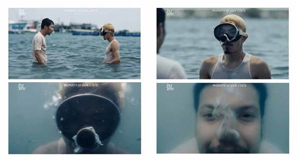 La función de la composición de estos planos consiste en que aísla los dos rostros para unificarlos en una misma situación corporal (escena del baile) o gestual (escena de la feria). En una bailan y en la otra cierran los ojos con gestos mínimos. No hay intercambio de parlamentos. Se trata de una convivencia. Su actividad es un estar allí de un modo en que uno observa al otro. El cambio se manifiesta en el tercer segmento (Figura 5) pues los personajes tienen un comportamiento gestual más activo, una interacción más íntima y emiten sonidos recíprocos debido a que practican un ejercicio de respiración bajo el agua. Incluso, hay un cambio en relación a las dos secuencias previas pues la cámara observa desde otros ángulos.