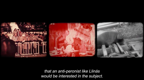El realizador ficticio, manipulando el material “real” que queda de esta época en la actualidad, crea una confusión de tiempos dentro de una misma imagen. Se superponen el pasado y el presente de un mismo archivo, a través de un entrelazamiento complejo entre ficción y documental. Esta superposición de tiempos nos reenvía a la noción de tiempo cinematográfico desarrollada por Deleuze en La imagen-tiempo (1987) y en la coexistencia de “capas de pasado” en una misma imagen (1987, 135-170). El ida y vuelta, entre tiempos en constante tensión, se resume en esta frase del texto de Marta Dillon acompañada de imágenes movidas que parece haber sido filmadas en fílmico (Figuras 4 y 5):