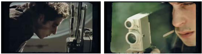 Los rollos de película, vestigios de este cine militante, están filmados en el presente de la filmación: polvorientos, aparecen como ruinas olvidadas, como materia en descomposición. El cortometraje de Carri resalta esta materialidad del archivo. Por un lado, estos rollos se manipulan en escenas experimentales donde están puestos a prueba “del presente” (en el agua, en la tinta); y por otro, los manipula también un actor (Esteban Lamothe, Figuras 2 y 3), en una suerte de ficción en el documental, donde el actor/personaje analiza estos “restos” y protagoniza a la vez un realizador de los años 1970 filmando (lo deducimos por su estilo vestimentario y por la película Super 8 usada para filmar esas escenas, característica de esta época).