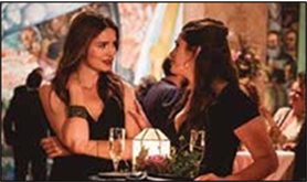 La secuencia empieza en el minuto 11´24´´ y se sitúa en un bar de copas, por la noche, después de que Cynthia y Hailey se conozcan tocando juntas en un concierto de jazz (Figura 3). Están sentadas con las copas vacías, cuando un camarero joven y fibrado se acerca y les trae su segunda ronda de whisky con hielo. El chico, mira a Cynthia y les invita a esa ronda. Ambas se lo agradecen, pero él solo hace caso a Cynthia, aunque luego lo conquistará Hailey. Cuando él se va, Hailey se queda mirándole el trasero embobada.