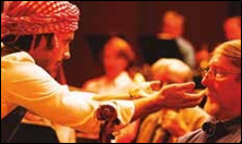 En la reconciliación entre los dos maestros se representa la alianza entre la tradición y la innovación. Por un lado, Rodrigo representa la ruptura con una tradición en su metodología. Además, viste de forma peculiar, con pañuelos palestinos y camisas hippys, o ponchos, monta en bicicleta, símbolos que pretenden asociarse a su conciencia social y su proximidad a la cultura popular, a ideas de izquierdas, ecologistas y progresistas, que ejemplifica llevando a la orquesta a ensayar a un descampado en medio de Nueva York de forma ilegal o actuar en Central Park. En realidad, entra en escena como una estrella del rock, y su comportamiento imprevisible, caprichoso y voluble contraviene las convenciones, como al elegir lugares extrambóticos para ensayar (Figura 8). Rodrigo no se comporta conforme a las expectativas que se tienen un director de orquesta: serio, sobrio, elegante.