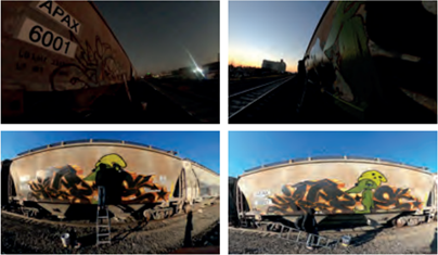 En esta ocasión no hubo ningún problema con la autoridad, fue en realidad un día tranquilo. Jupiter decoró un vagón de lado a lado (end-to-end) con un wildstyle de color negro amarillo y al centro un caracter de la famosa Razzberry, aquella lagartija verde que junto a Cheech Wizard, han formado parte del repertorio simbólico de los escritores (Figuras 3-6). Esta intervención, sin duda, es más que una apología del graffiti neoyorquino, es el graffiti neoyorquino aplicado en otra ciudad. En ese orden de ideas se puede argumentar que la experiencia mediatizada, cuando se pone en práctica, se vuelve experiencia aplicada. Cómo trazar, rellenar, recortar, el estilo de las letras, la importancia de ese carácter particular, el conocimiento para ingresar a las yardas, reconocer las frías o las calientes, además de las rutas de escape, son algunas de las experiencias que circulan de manera mediatizada o vivida. Sin embargo, todos estos saberes plasmados en el muro o en el vagón se vuelven una experiencia aplicada y en el caso del freight graffiti, una experiencia aplicada itinerante. Esta característica será el punto de partida para conceptualizar el graffiti en tránsito.