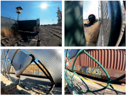 Al ingresar desde la av. Mariano Otero por la av. Inglaterra del lado izquierdo encontramos una pared de hormigón con unos picos de protección y la vía por donde circula el tren sin obstáculos. En este primer patio, de acceso más o menos libre, se encuentran doce líneas donde se pueden distribuir los trenes que serán estacionados o desmontados. En esta ocasión encontramos solamente un autorack, un tipo de material rodante que transporta principalmente automóviles y que es casi seguro que cruza la frontera. “Jupi” se mostró un poco decepcionado por dejar pasar esta oportunidad, la yarda estaba sola, sin vigilancia y había encontrado un soporte que tendría la certeza que viajaría. Recordó el papel de “los caminantes”, integrantes del crew que tienen como función principal recorrer tanto las vías, como las yardas ferroviarias, cazando este tipo de oportunidades; además de que reconocen o generan las formas de ingresar y estrategias de escape en patios más vigilados e incluso cercados (Figuras 7-10).