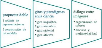 En una crítica de la cultura visual y al poder de las imágenes, Mitchell postula el giro pictorial, retomando la noción de anomalía de Kuhn y la iconología de Panovsky (1994, 21). Este giro pictorial implica la extensión de las artes visuales al trabajo interdisciplinario para caracterizar los fenómenos postmodernos como las meta imágenes, la écfrasis y el ensayo fotográfico, enfatizando el cambio de la posición del espectador y los efectos cognitivos de la apropiación de los discursos visuales. Este “espectador emancipado” (Ranciere, 2008), y la correlación del ver y el saber, son la clave para comprender una nueva organización del conocimiento en la lógica hipertextual (Scolari & Rapa 2019, 38) de los discursos contemporáneos. Mención aparte merece el giro afectivo vinculado a la biopolítica, las teorías de la subjetividad y al psicoanálisis (Lara & Enciso, 2013, 108), donde el lenguaje de las emociones se torna central para la toma de decisiones, junto a la ciencia del big data que traduce en grafos o nubes de palabras los discursos mediáticos.