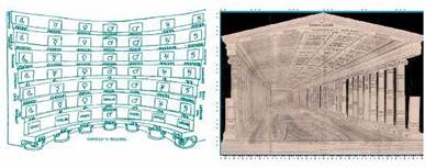 Este teatro, Camillo lo construyó de madera y era de grandes dimensiones, a modo de un archivero enciclopédico de los saberes del que Wenneker hizo una reconstrucción de cómo pudo haber sido (Figura 11). Algunos de estos modelos tuvieron sus aplicaciones a otras ramas del saber, en el caso de Camillo sirvió como referente para otros sistemas mnemotécnicos, en el siglo XIX aparecen otros ejemplos como el Templo del tiempo de Emma Willard, quien en 1846 diseñó un crono-historia donde cada columna vertical representa un siglo y se destacan los nombres y acontecimientos históricos importantes. Cabe destacar que el modelo en pilares de Willard se parece al primer modelo de Ciencia Abierta sostenida en pilares.