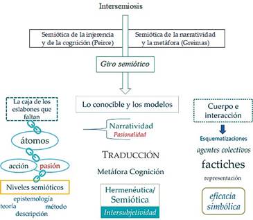 El giro lingüístico como deconstrucción del lenguaje, como se presenta en la Figura 2, lleva a la confusión babélica de métodos y teorías, los cambios de episteme y las extensiones a sustancias expresivas diversas de los discursos surge La svolta semiótica (Fabbri, 1998) como la intersección de dos caminos seguidos por la filosofía, la metáfora y la cognición que fusiona ambas estrategias: cultura científica y humanismo: Si la estética va hacia la ciencia, la ciencia va hacia la estética (Fabbri, 1998, 19). El modelo de Fabbri retoma métodos descriptivos, lógica actancial, la metáfora y la cognición; haciendo énfasis en la subjetividad y los componentes hermenéuticos de no la ciencia, del mismo modo que lo habían hecho Rorty, y posteriormente Deleuze en El pliegue (1988). Tanto el giro lingüístico como el semiótico se sitúan en la encrucijada de la metáfora y el silogismo, del arte y la ciencia, a la vez que anuncian el cambio de la sustancia de la manifestación y los fenómenos de traducción y trasposición entre distintos lenguajes y/o códigos.