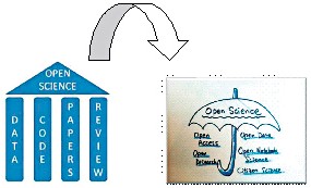 En este modelo la Ciencia Abierta está sostenida en cuatro pilares que son: los datos, el código, los trabajos científicos y la revisión, y está basado en una concepción positivista, donde la comprobación está al centro de la validación de la ciencia. La segunda representación transita hacia otro modelo visual que es el paraguas, propuesto por Eva Méndez (2018) como si la ciencia cubriera o abarcara 5 elementos, Méndez utiliza el paraguas (Figura 5) como una metáfora de que la ciencia protege o resguarda todos estos aspectos (aunque pareciera defenderse de una tormenta), el paraguas funciona a modo de círculo que contiene todos esos elementos sin ningún orden o posible relación, agregando los elementos de la ciencia ciudadana, la ciencia de cuadernos abiertos y cambiando el código abierto por acceso abierto, igual que los trabajos científicos los cambia por investigación abierta, el único elemento que queda igual son los datos abiertos.