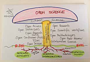 A modo de estado de la cuestión se realizó un recorrido sobre las representaciones de la Ciencia Abierta para hacer un análisis de los componentes y sus implicaciones en el concepto actual de ciencia. Dando como resultado una composición de imágenes que juegan con diferentes elementos considerados por variados actores y autores como base o catálogo en formatos multimodales, pues han sido compartidos en papers, brochures, documentos oficiales en plataformas y soportes que articulan un concepto ciencia bajo el paradigma de apertura. La primera representación visual de la Ciencia Abierta es una imagen de cuatro pilares en una especie de Partenón Griego (Bynes et al., 2013):