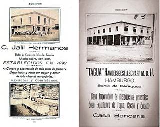 Sin embargo, también la creciente economía, no sólo atrajo a los comerciantes locales. Moreno sostiene que, como Bahía ya era el segundo puerto exportador del Ecuador, fue llamando la atención de los extranjeros que vivían del comercio. Este fenómeno comercial logró que algunas familias europeas se asentaran y construyeran negocios. Aunque una de las casas comerciales más fuertes era la de los Jalil, familia libanesa bastante influyente en la ciudad que provenían de Chone, también funcionaba otra casa comercial muy importante, la casa Tagua, formada por familias alemanas, que importaban productos extranjeros a la ciudad (Figura 5).