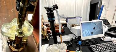 El microscopio seleccionado fue un LOMO УШМ-1, equipado con un ocular 1.5x y un objetivo 20x. Fue construido en los años 80 por la URSS. La parte utilizada fue el tubo, donde se encuentran los lentes (objetivos) que permiten el agrandamiento de las estructuras microscópicas (Figura 10). Para mantener el tubo vertical de forma invertida, se imprimió en 3D una pieza en forma de tornillo que permitió fijar el microscopio y enfocar las micorrizas que crecían en la base de la caja de cultivo también impresa en 3D (Figura 11).