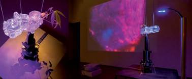Este acercamiento a los cultivos in vitro, que forman parte de los experimentos que analizan de manera “estéril” la asociación micorrízica, permitió identificar una serie de condiciones específicas de los materiales y formas que se derivan de estos procesos de laboratorio. Las cualidades matéricas de los elementos, como la transparencia del medio de cultivo que facilitan el estudio y visualización al microscopio de las estructuras biológicas dieron, a su vez, paso al trabajo con las formas rizomáticas y la proyección de estructuras a través de elementos lumínicos.