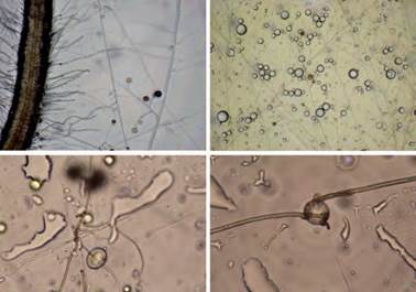 Una de las simbiosis mutualistas, donde se ha observado que dos organismos pueden beneficiarse, es las micorrizas, que implica una relación entre hongos y raíces (Smith & Read, 2008). Los hongos micorrízicos arbusculares (HMA) son simbiontes obligados que dependen de la presencia de la raíz para poder realizar su ciclo de vida. El hongo penetra en la raíz por medio de la formación de hifas, que semejan a mangueras muy delgadas (Figura 1). Al ingresar, formarán otras estructuras como los arbúsculos donde se realiza el intercambio de nutrientes dentro de las células de la raíz, las vesículas que son estructuras de almacenamiento de fosfolípidos y las esporas que son también estructuras de almacenamiento y propagación (Souza, 2015; Walker et al., 2018).