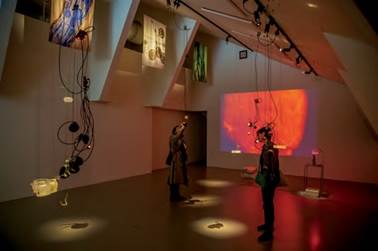 El montaje de la obra se realizó durante dos semanas, con la ayuda técnica del equipo Musée L y con el diseño museográfico de la artista y docente Gabriela Fabre, de la Universidad de las Artes de Guayaquil (Figura 12). El planteamiento de puesta en escena buscó crear un espacio inmersivo con varios niveles de intervención. Las esculturas se colgaron a distintas alturas, replicando de esta manera la aleatoriedad en el espacio en la que crecen los hongos micorrízicos. El concepto lumínico de la instalación siguió los descubrimientos realizados en el laboratorio y fitotrón, durante la residencia artística. La transparencia de las esculturas y el medio de cultivo permitió al público observar fácilmente el crecimiento de raíces y plantas. La proyección a tiempo real de los hongos creciendo en una de las esculturas estaba compuesta por un ciclo lumínico de colores cálidos a fríos completando la experiencia audiovisual del proyecto.