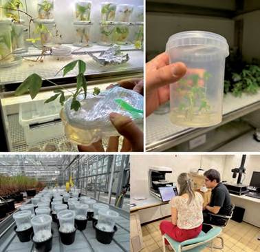 La residencia empezó con la inmersión del artista en los procesos de laboratorio y su familiarización con las herramientas para producción de imágenes (microscopios, estereoscopios), el análisis del crecimiento de las micorrizas in vitro, y la revisión de experimentos en invernadero, cámaras de cultivo y entrevistas con los diversos investigadores del laboratorio (Figura 5).
