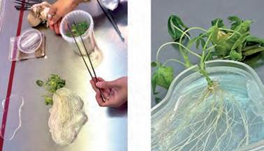 Esta experiencia directa con los procesos de laboratorio permitió identificar y probar diversos caminos para la producción de las obras que posteriormente fueron parte de la instalación. Especialmente relevante fue la visita al área de fitotrones (cámaras de crecimiento con condiciones lumínicas y de humedad altamente controladas) (Figura 5). A partir de los diferentes experimentos en condiciones in vitro de plantas de maíz, yuca y banana, se probó cómo la transparencia y crecimiento rizomático evidenciaban un gran potencial para la generación de posibles procesos escultóricos y compositivos (Figura 6).