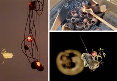 El uso de Fablabs permitió combinar elementos de las nuevas tecnologías en arte con procesos de manufactura manuales, materiales tradicionales como la cerámica y biomateriales como la membrana de SCOBY (Simbiotic Culture of Bacteria and Yeast; en español, “colonias simbióticas de bacterias y levaduras”). A través de la combinación de estas técnicas, se propuso un posicionamiento sobre un imaginario tecnológico que atiende a la huella y el trazo de la producción física humana, además de la posible inclusión de elementos biológicos simbióticos. Por otro lado, las técnicas cerámicas son procesos situados en el contexto del sur global, aspecto que fue un punto de referencia para ese proyecto (Figura 9).
