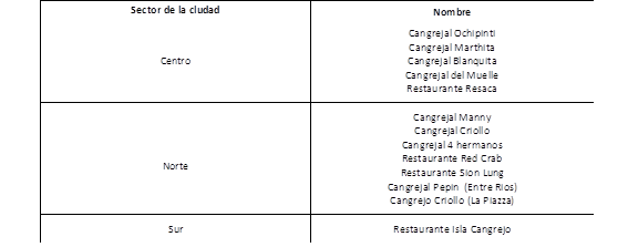 En la elaboración de este estudio, se tomaron en cuenta los cangrejales previamente enlistados en la Ruta Turística Gastronómica del Cangrejo, como puede observase en la Figura 1.