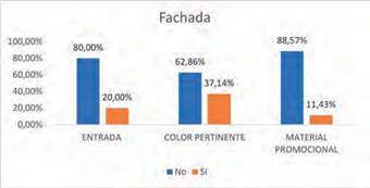 Para del presente análisis de los cangrejales, considerando el diseño exterior planteado en las categorías visuales, se ha incluido en la observación del valor “Fachada”, que incluye las variantes de arquitectura y escaparates. También se usó el término “entrada” en reemplazo del valor puertas. Esto dio como resultados el que, en el 80% de los casos, los locales no parecen haber considerado estas variables como uno de los componentes de la experiencia de usuario.