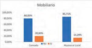 En segundo lugar, dentro de la misma categoría diseño interior, se consideró la variable de la organización encasillándola como “mobiliarios”. De estos, el resultado fue que en un 80%, no se veían cómodos y que, en un 85%, tampoco eran alusivos al local (Figura 13).