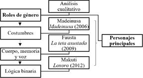 Como se puede apreciar en la Figura 1, en el presente estudio se localizan dos campos conectados entre sí, y las diferentes fuentes bibliográficas consultadas para su desarrollo serán sólo aportes femeninos y, en su mayoría, latinoamericanos. Esta decisión se basa en que, si bien desde la producción académica se han abierto vías para un pensamiento crítico, este no deja de ser elitista y, sobre todo, androcéntrico (Curiel, 2007, 100). Asimismo, el feminismo de color latinoamericano se muestra crítico con la teoría clásica masculina, por su nula consideración de las realidades de las mujeres colonizadas y racializadas (Espinosa-Miñoso, 2014, 8). Por último, el movimiento feminista, como actor político desestabilizador, busca erradicar las ideas intelectuales de un ser jerárquicamente superior, gracias al proyecto emancipador cuyas reglas no estén medidas por el autoritarismo masculino (Uriona, 2012, 26). Entonces, los terrenos que comprenderán el estudio serán los siguientes: análisis de los personajes principales y análisis de los roles de género, abordándolo desde la perspectiva del cuerpo, las costumbres, las memorias y la voz de la mujer; y también desde el binarismo, comprendido como una lógica naturalizada.