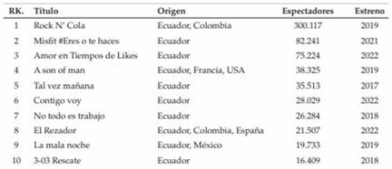 Esta tabla revela datos interesantes, si revisamos el número de espectadores que alcanzan algunas producciones y los comparamos con el valor del presupuesto de las mismas. Con excepción de dos películas (Rock N’ Cola y Tal vez es mañana) se podría decir que el resto de films no logran recuperar su inversión sólo con la taquilla de los cines. Por ejemplo, la película Amor en tiempos de likes tuvo un presupuesto de más de $ 500.000, según una información ofrecida por el diario El Comercio, y si se multiplica su número de espectadores por el valor promedio de entrada en el país, que es de $ 4.3, la recaudación que alcanzó fue de $ 323.463 (Criollo, 2022).