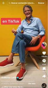 Por su parte, Guillermo Lasso, que llegaría a ser presidente electo del Ecuador, al principio mencionó que no tenía interés en utilizar TikTok. Sin embargo, el 25 de febrero, previo al inicio de la segunda vuelta electoral, abrió su cuenta en esta red social, que tan solo un día sumó 112 mil seguidores (información tomada de la cuenta oficial del candidato, 25 de febrero del 2021). Esta estrategia se sumó a su campaña con la finalidad de acaparar la atención de un público más joven. Lasso utilizó esta red social para posicionar estratégicamente su imagen política y crear una narrativa propia para esta comunidad (Figura 1). Otros candidatos a la presidencia, como Arauz y Pérez, también se abrieron cuentas en TikTok (Figura 2). Su objetivo era no quedarse atrás, y captar la atención del público más joven, buscando popularidad, y que sus mensajes se han tendencia en redes sociales (Obando, 2021).