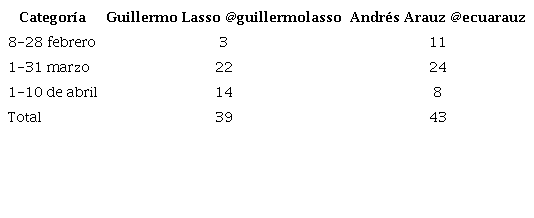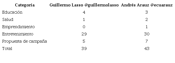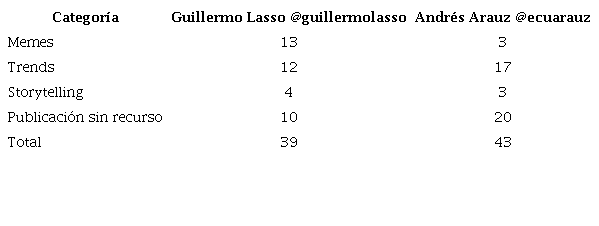Sumado a esta investigación, se realizó un análisis del propio contenido de las cuentas oficiales de TikTok de los dos candidatos, Lasso y Arauz. Se procedió a examinar las estrategias de comunicación política implementadas en esta red social. Los candidatos presidenciales Andrés Arauz y Guillermo Lasso abrieron sus cuentas de TikTok (Arauz el 14 de diciembre del 2020) y (Lasso el 25 de febrero 2021). Por su parte, Arauz presentó una ventaja con el uso de TikTok durante el periodo de la segunda vuelta electoral realizó 43 publicaciones audiovisuales, mientras que Lasso alcanzó a publicar 39.