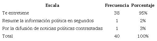 La presente investigación se desarrolló en el cantón La Libertad, provincia de Santa Elena (Ecuador), considerando la población del barrio General Enríquez Gallo, con una muestra de 40 jóvenes de 17 a 20 años, usuarios de la red social TikTok, a quienes se les realizó una encuesta con relación al uso que hacen de TikTok y sobre el contenido político que visualizan. Véanse las Tablas 1, 2, 3, 4, 5, 6 y 7 que se ofrecen a continuación, en las que se presentan los datos obtenidos de dichas encuestas.