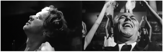 La teatralidad de los personajes es uno de los componentes del distanciamiento en la estética materialista que el dramaturgo marxista Bertolt Brecht utilizaba en su Teatro Épico para generar precisamente un distanciamiento entre la obra y el espectador. En Terra em transe este componente está presente. Es la tensión constante de los personajes la que crea la emoción ideológica; el peso de la actuación está en el carácter teatral del personaje, y los contrastes de luz en los rostros a manera de una iluminación expresionista crean esa tensión dramática teatral. La abolición de los tiempos y de la narrativa configuran una forma estética que, a su vez, es un acontecimiento revolucionario desde el punto de vista artístico y cultural. Este film adquiere un carácter performativo4, en el cual el vigor está en la experiencia de vida proporcionada por la contingencia a la que se debe ese carácter performativo (la figuración que la acompaña en la creación misma). En la Figura 3, podemos observar el carácter teatral tanto de los personajes como de la puesta en escena; las expresiones “sobreactuadas” y la iluminación de corte expresionista exhiben la presencia una estética materialista.