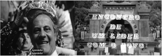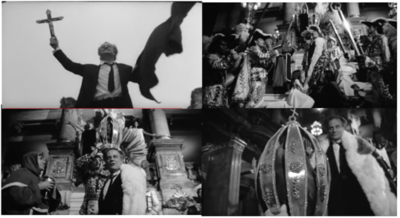 A través de Terra em Transe, Rocha nos brinda una poética construida alrededor de una crítica profunda a la colonización y al imperialismo. Por ejemplo, los planos cerrados y contrapicados del conservador Díaz que denotan poder y autoridad; sustenta una corona al estilo monárquico, y después de un silencio abrupto que pone fin a los planos sonoros y al montaje disruptivo que le anteceden, repite: “Aprenderán, dominaré esta tierra, pondré esas histéricas tradiciones en orden, por la fuerza de la armonía universal de los infiernos llegaremos a una civilización”. “¡Aprenderán!” es el mensaje del colonizador instruyendo a los salvajes, a los subdesarrollados, representados en el comunismo tosco que las clases dominantes niegan porque se sienten amenazadas por el espectro revolucionario que derrotaría al imperialismo en el marco de la Guerra Fría, cuando el capitalismo estaba en un momento de expansión y las oligarquías acentuaban su poder. Por eso, hay que destacar el valor marxiano del comunismo tosco en un abigarramiento de imágenes en función de un montaje totalizador que nos pone de frente a la misma lucha de clases y a los procesos de dominación que ha atravesado al mal denominado “Tercer Mundo”. En la Figura 6, pueden observarse los símbolos religiosos de los que echa mano el personaje conservador Porfirio Díaz; el “civilizado” repudia la mística de los pueblos, pero se vale de un proyecto evangelizador como poder supremo de conquista y dominio.