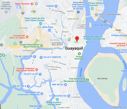 El punto rojo que se aprecia en la Figura 2 indica la ubicación del Cementerio General de Guayaquil, localizado en pleno centro de la ciudad. Al norte se ubican sectores de clase acomodada como Urdesa, Los Ceibos y Samborondón. Este último es un sector henchido de ostentosas mansiones, como la del magnate y cinco veces candidato presidencial Álvaro Noboa -padre del actual presidente (2024), Daniel Noboa- ubicada en la urbanización “El Río”. Al sur de Guayaquil, por el contrario, se encuentran los sectores más pobres de la urbe, tales como los suburbios y el famoso Guasmo, una unión de barrios que ocupa gran parte del sur de la ciudad.