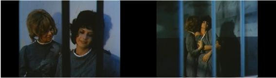 Al margen de una pelea provocada por una presa que se burla homofóbicamente de otra, gritándole “tortillera”, la cámara muestra a María, a través de los barrotes, abatida junto a otra mujer. A continuación, se produce una transición a una breve secuencia de las dos mujeres acariciándose apasionadamente en una celda (Figura 1). La transición espacial es marcadamente brusca, el sonido está fragmentado y hay un montaje paralelo fugaz entre las dos tomas. Según Ruétalo, es posible que la torpedad de esta escena se deba a la intervención del director del INC, Ramiro de la Fuente, en la realización de los cortes (2022, 107). No obstante, Ruétalo también identifica otros momentos torpes en el montaje para preguntarse si Bó intentaba deliberadamente llamar la atención sobre la censura que sufrían sus películas (2022, 106). Intenciones directorales aparte, la mirada inicialmente distante de María y la transición inestable, que hace que el segundo plano aparezca desde su punto de vista, generan momentáneamente la sensación de que la imagen sexual es la fantasía frustrada de la propia María.