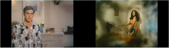 Nuestro análisis de esta escena recupera ciertos elementos de una reseña de la película de 1974, en la que el crítico Máximo Soto anticipa la reevaluación reciente del cine de Bó al situar la trama -“reaccionaria y paternalista”- en contraste con la forma -“revolucionaria y transgresora”- (1974, 18). Soto califica Intimidades de una cualquiera de “vanguardista” por la recurrente reflexividad formal del film sobre el espectador y, en particular, sobre el voyeurismo y la masturbación (1974, 18-19). En este sentido, la forma voyeurista y casi onírica de la intimidad lesbiana en la cárcel se hace eco de una escena anterior en la que el adolescente, cuyos padres quieren que María lo inicie en el sexo, contempla atontado el cuerpo vestido de la protagonista. A continuación, un plano contraplano, cuya forma fugaz e inestable anticipa directamente el montaje de la escena carcelaria analizada arriba, revela el cuerpo desnudo de María en su imaginación (Figura 2). El objetivo parcialmente manchado de la cámara sitúa a los espectadores como testigos de una fantasía degradada, que pronto se convierte en un flashback de la propia masturbación del adolescente.