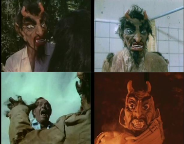 Quiero detenerme en un último detalle, lo que podría significar un cuarto giro en la trama de Embrujada, quizás el más sutil. Se trata del diseño visual del Pombero, de la aparición que primero Ansisé ve y luego, antes de morir, también Leandro y Juan. Según se lo describe a Juan, el Pombero aparece “con ropa vieja y una cara atroz”. Pero esa cara grotesca y ridícula que vemos no está hecha con maquillaje sino con una máscara, lo que acrecienta el tono barato de la filmación, improvisado, precario. Sin embargo, si prestamos atención a sus apariciones tanto para tener sexo con Ansisé como para matar a sus pretendientes, quizás podamos entenderlo de otra manera: en esos momentos se incluyen inserts de imágenes de la misma película o de la tribu Macá filmada para India en un montaje un tanto frenético que genera una sensación de desrealización onírica y confusa, cargando de ambigüedad esos momentos.